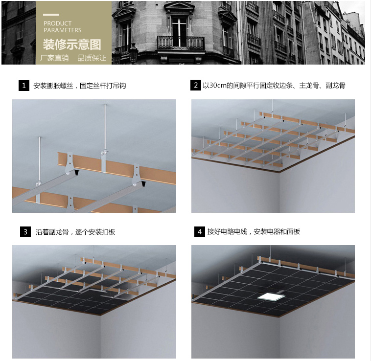 明架鋁扣板天花吊頂廣泛應(yīng)用于高級寫字樓、辦公室、走廊、機場、車站、廠房、醫(yī)院、會所、銀行、商場、展覽館等。