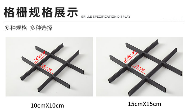 鋁格柵吊頂格子尺寸:分別有50 X 50,75 X 75,100X100, 110X110, 125X125, 150X150,175 X175, 200X200、250X250、300X300 (格子大小可根據需求進行選擇)