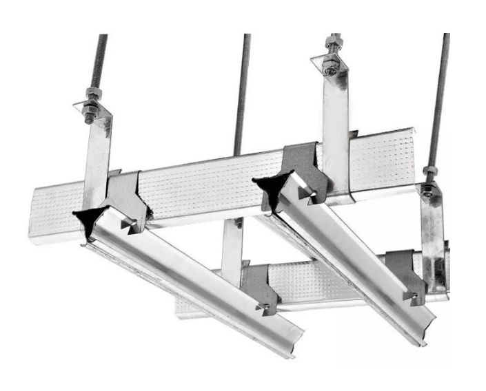 3、把預(yù)裝在三角龍骨上的吊件連同三角龍骨與輕鋼龍骨成垂直方向按板材間距連接好,然后調(diào)整水平